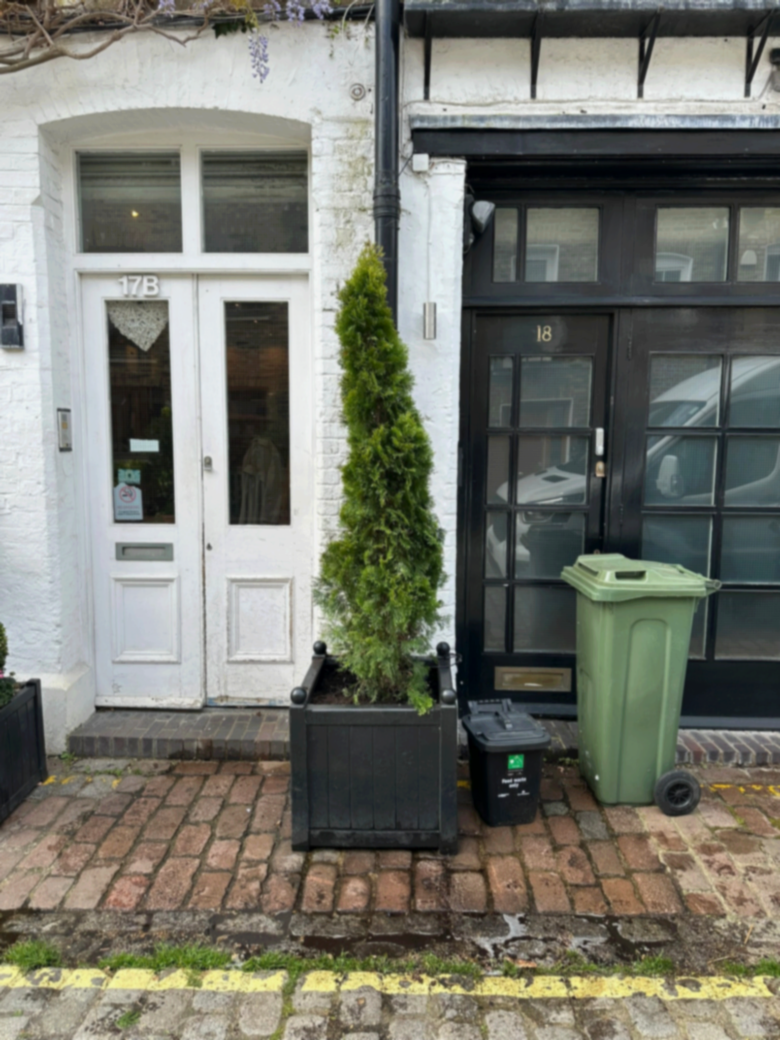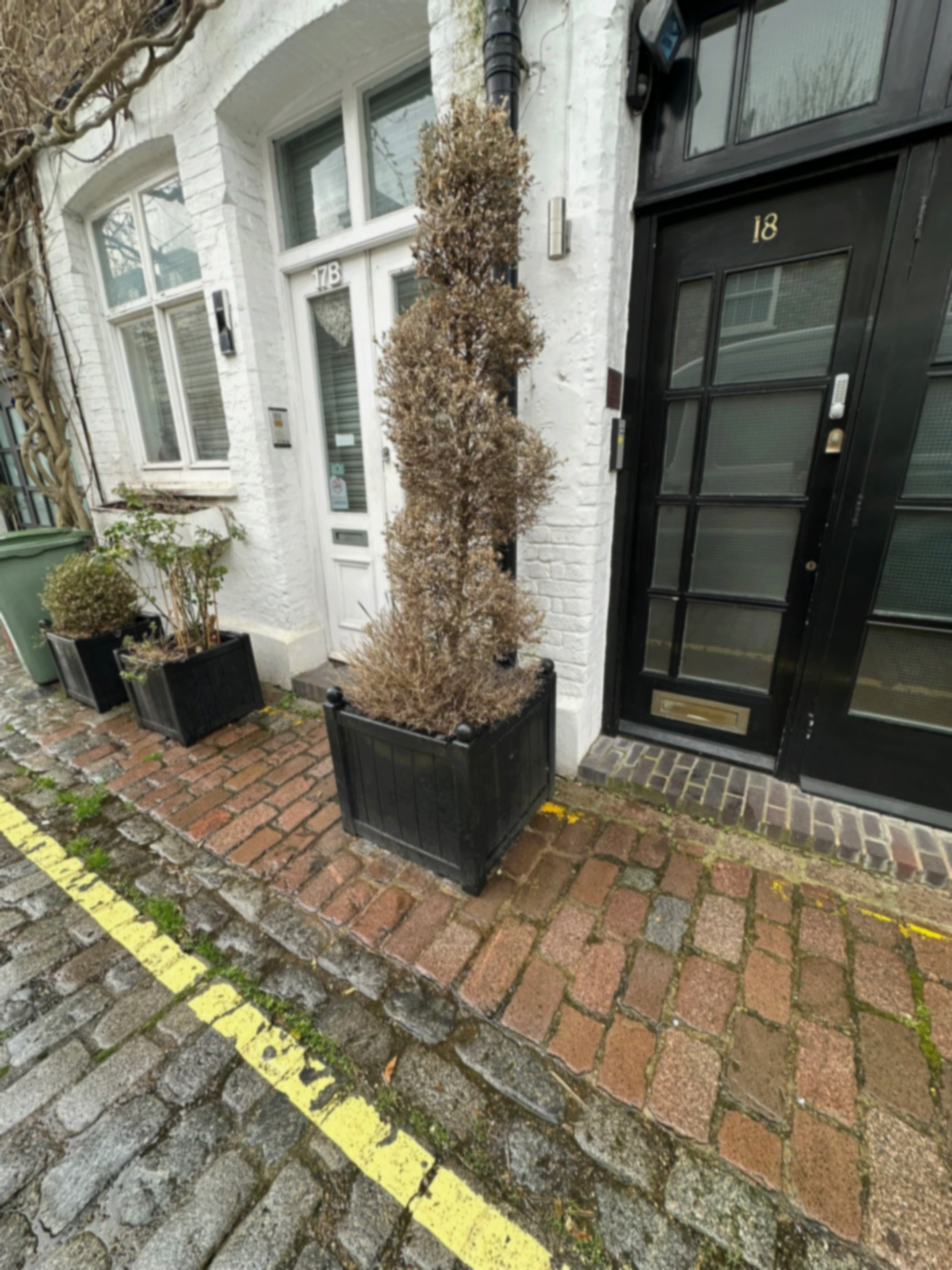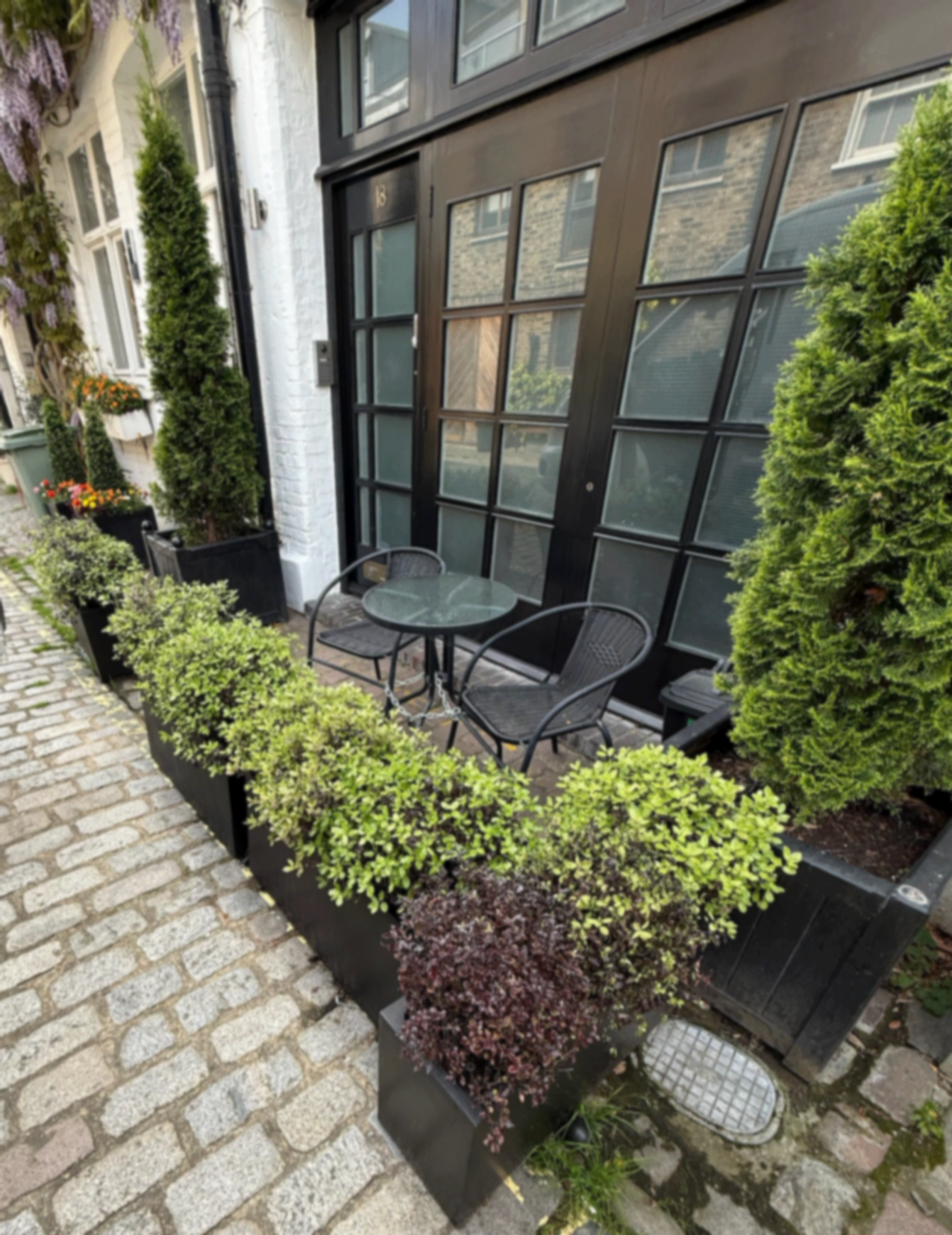 Pullinger Landscapes was tasked with bringing life and vibrancy to the front of this charming mews house. The goal was to soften the exterior and create a welcoming, stylish space for the homeowners to enjoy their morning coffee. To achieve this, we introduced elegant faux Buxus balls beneath the windows, adding structure and year-round greenery without the need for maintenance. At the front of the property, carefully positioned Pittosporum shrubs were planted to frame a small seating area — transforming an otherwise unused space into a calm, inviting spot to relax and watch the world go by. This simple yet effective design demonstrates how thoughtful planting and layout can completely change the feel of even the smallest urban frontage, adding both colour and character to the home.